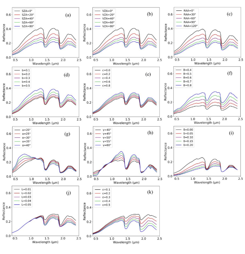 图1. HBiM2模型关键参数对土壤光谱反射率的影响。(a)太阳天顶角,(b)观测天顶角,(c)相对方位角;(d)土壤颗粒散射形状与分布参数 b,(e)土壤颗粒散射形状与分布参数 c,(f)土壤亮度参数 B,(g)土壤光谱形状参数 α,(h)土壤光谱形状参数 γ,(i)土壤颗粒体积分数 δ,(j)水膜厚度 L,(k)水膜覆盖比例 ε。图中展示了不同观测几何条件及关键物理参数变化对土壤光谱反射率的影响特征。