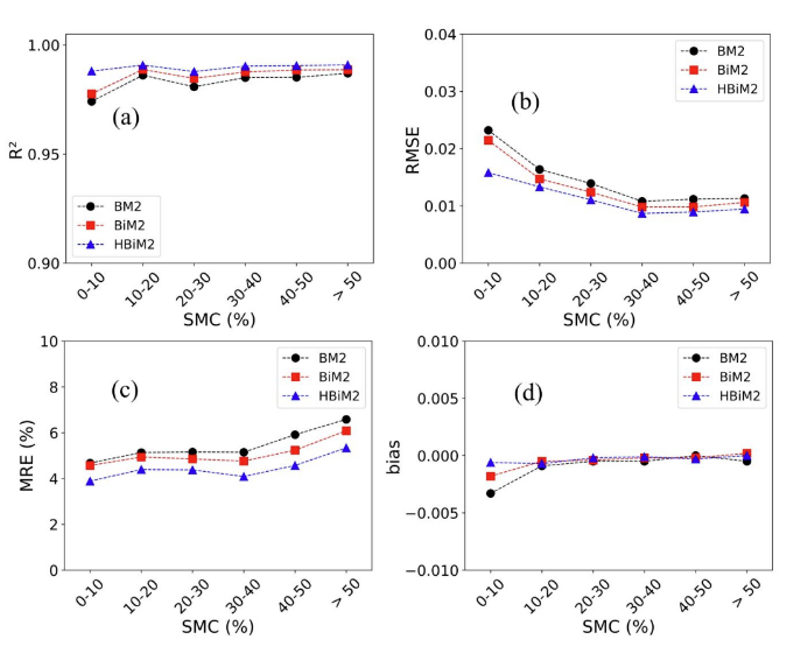 图6. 不同模型在不同土壤含水量(SMC)条件下的反射率拟合精度对比。黑色、红色和蓝色分别表示BM2、BiM2和HBiM2模型。图中展示了三种模型在不同土壤含水量水平下对土壤反射率的拟合效果,对比评估了模型在湿度变化条件下的适用性及HBiM2模型的改进优势。