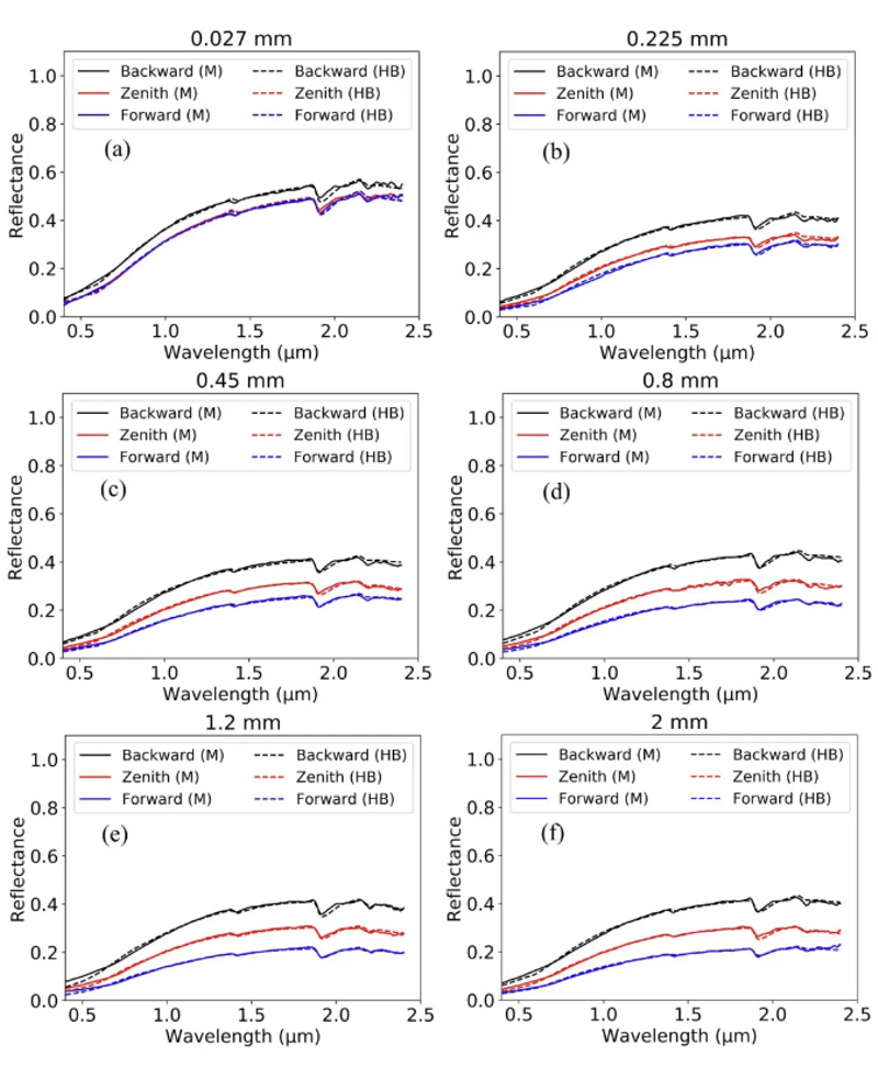 图2. 不同土壤粒径条件下干土(HB)模型的验证结果。基于BS04土壤样本,在三种典型观测几何条件下对HB模型进行验证:(a)0.027 mm,(b)0.225 mm,(c)0.45 mm,(d)0.8 mm,(e)1.2 mm,(f)2 mm。三种观测几何分别为:后向散射(黑色)、近天顶观测(红色)以及前向散射(蓝色)。图中实线表示干土实测反射率(M),虚线表示HB模型模拟结果(HB),用于对比不同粒径及观测条件下模型的拟合性能。