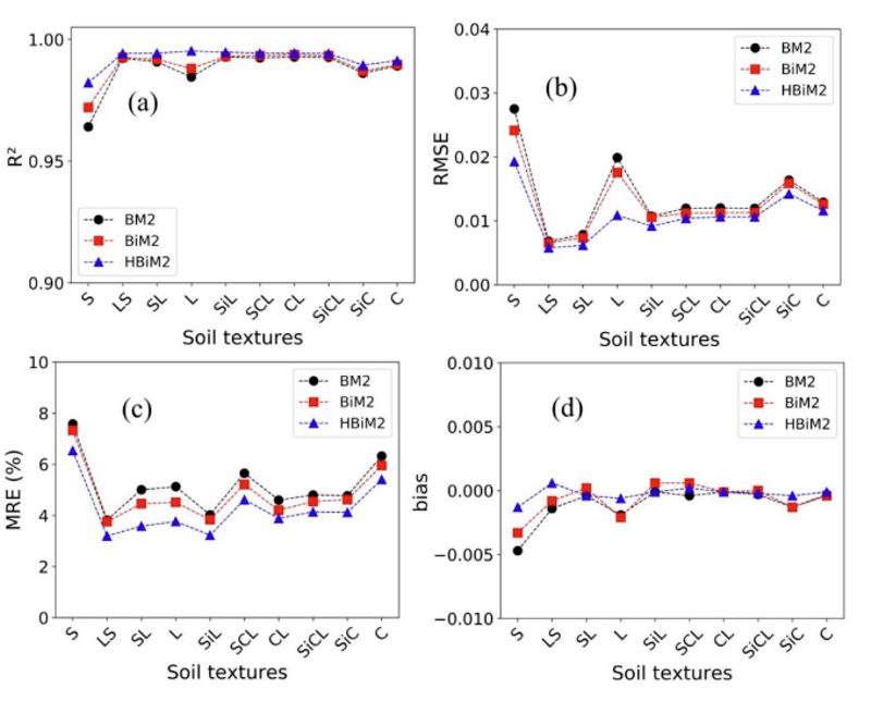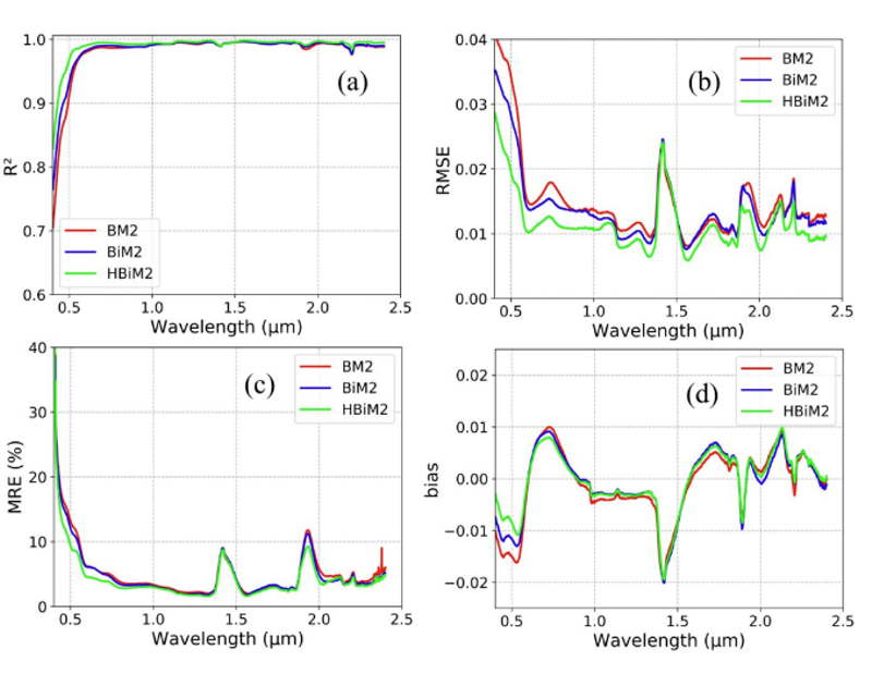 在10种土壤质地、14种土壤粒径及不同土壤水分条件下,HBiM2模型在多种观测几何条件以及400–2400 nm光谱范围内均表现出较高精度(R² > 0.95,RMSE < 0.02),相较传统土壤模型具有明显优势。